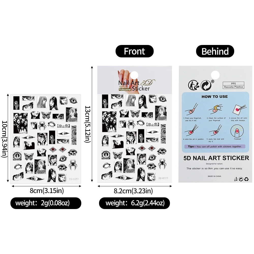 Adesivo 5D Relevo para Unhas — Halloween Horror Comics Girl Plástico | Estilo Japonês | Aranha, Olhos & Personagens Anime